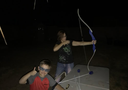 Archery? The bow and arrow have been around for a long time. We use light weight bows and foam tipped arrows so there is no risk of getting hurt. First, we will teach safety (we don’t want to instill bad habits), then, once you have the knack, you may want to go to the pointy stick archery.